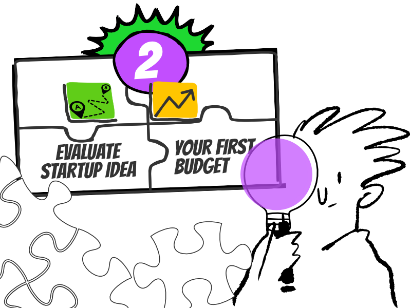 Continue to sharpen your idea on the journey that unfolds in this ten-piece puzzle. The two pieces in this second step are: "Evaluate startup idea "and "Your first budget".